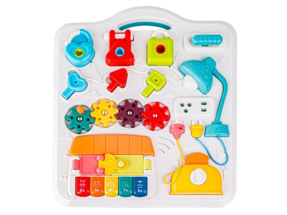 Panel może posłużyć za stolik po zamontowaniu nóżek lub jako zabawka sama w sobie. Zestaw wyposażony został również w dwa paski, które możemy zapiąć od tyłu panelu. Dzięki temu zabawkę możemy powiesić np. na łóżeczku czy ścianie. Panel posiada również uchwyt dzięki czemu łatwo zabrać go ze sobą.
