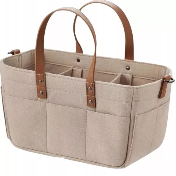 Nasza beżowa torba-organizer z filcu pomoże Ci zachować porządek w dziecięcych akcesoriach i codziennych drobiazgach.